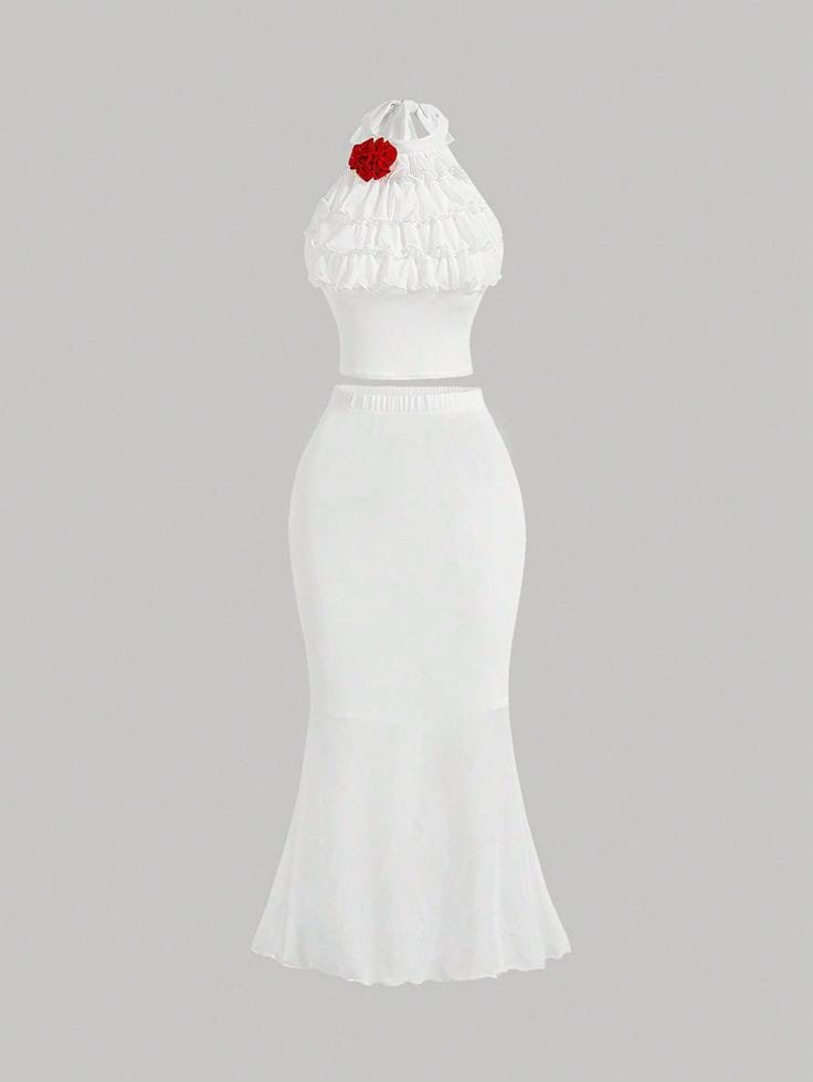 Set de blusa de cuello halter con detalle de rosa y falda acampanada
