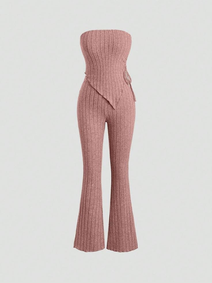 Set casual de blusa asimétrica sin tirantes y pantalón acampanado